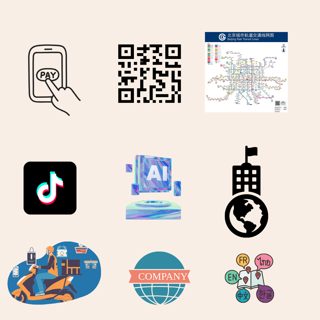 An illustration showcasing key aspects of modern and international living, including QR code payments, AI technology, Beijing’s subway map, and global communication icons. Perfect for promoting a summer camp in Beijing that offers students a comprehensive experience of technology and culture.