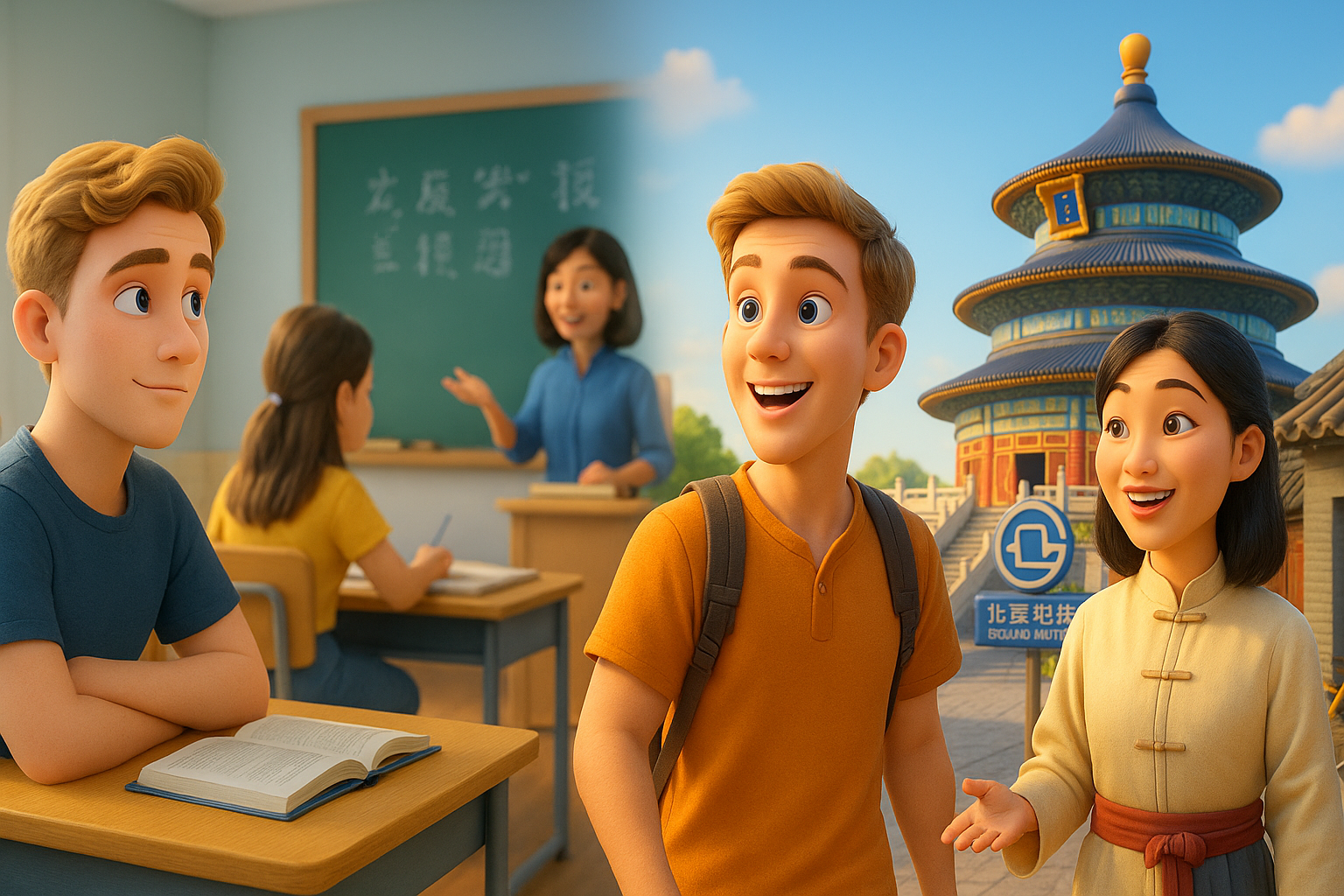 A cheerful 20-year-old Caucasian boy experiencing Chinese summer camp in China, learning Mandarin with a Chinese teacher near the Temple of Heaven in Beijing, contrasted with a traditional classroom setting.