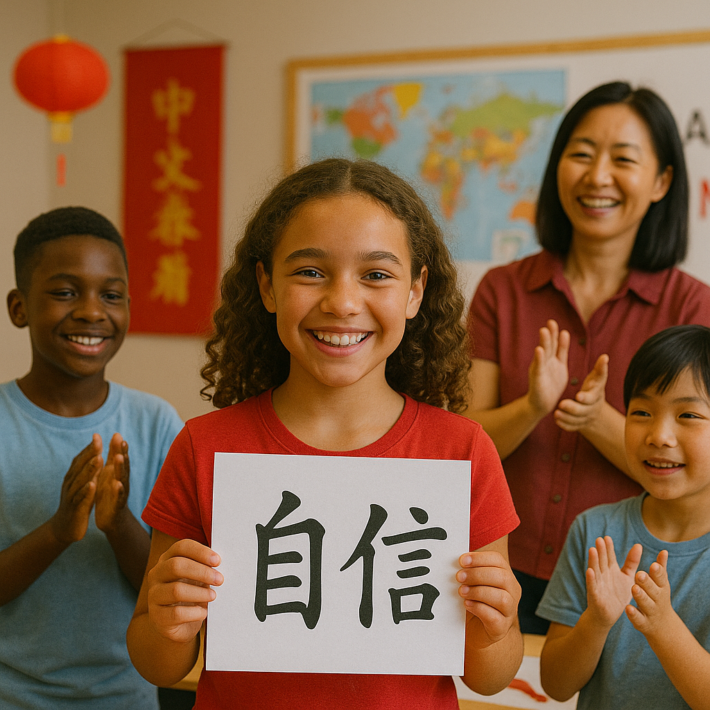 A confident young girl holding a Chinese calligraphy sign for “confidence” in a classroom, surrounded by diverse classmates and a smiling teacher at a Chinese summer camp in China.