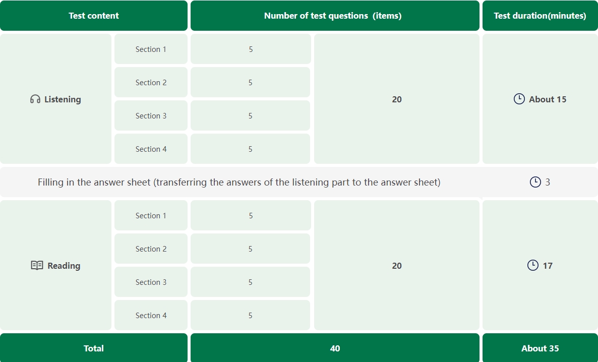 HSK (Level 1) has a total of 40 questions, divided into listening and reading sections. The entire exam takes about 40 minutes (including 5 minutes for candidates to fill in personal information).