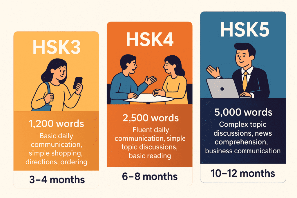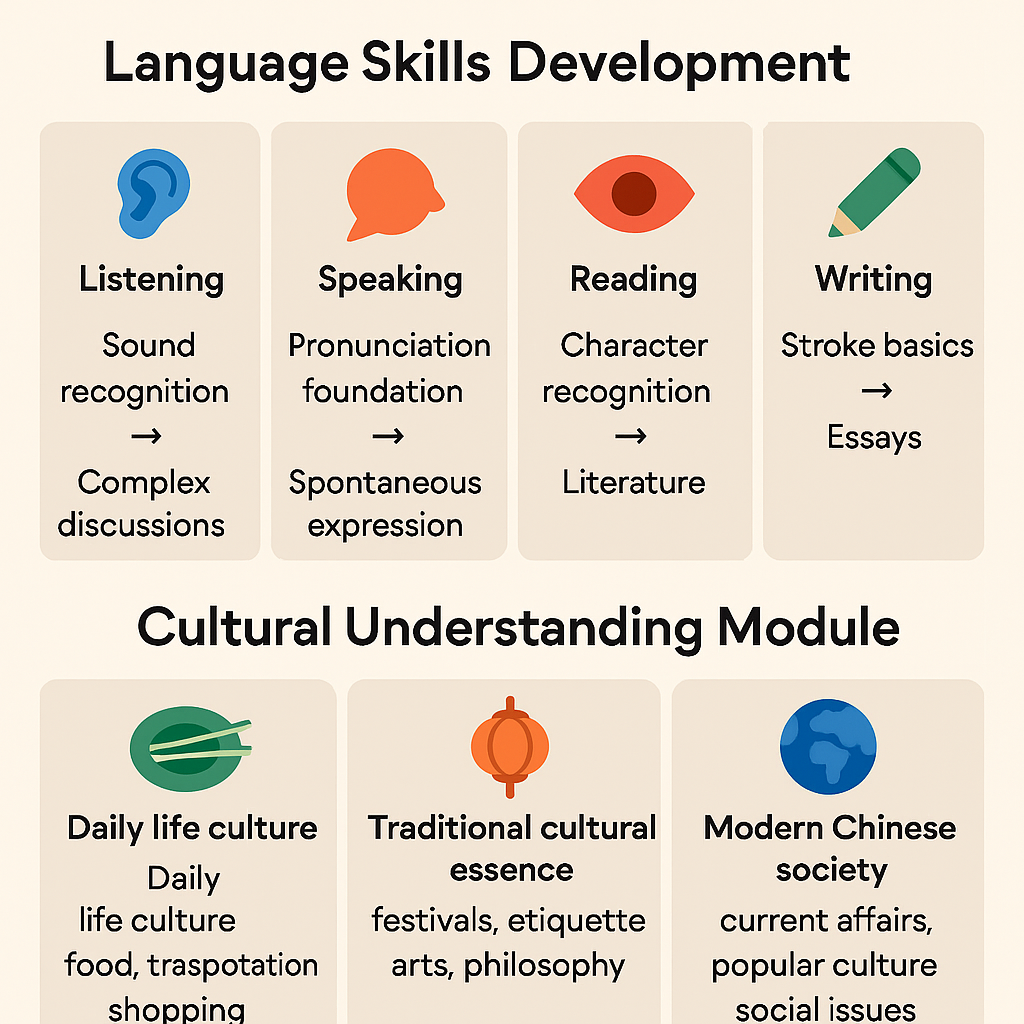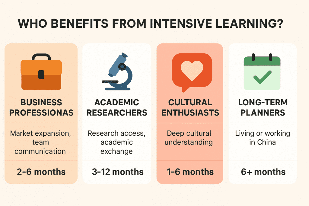 | Moderate (15-20 hours/week) | • 3-4hrs classroom daily • Cultural activities | • HSK3 in 6 months • HSK4-5 in 12 months | • Working professionals • Long-term residents |