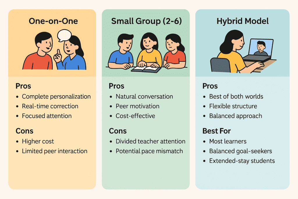 | Small Group (2-6) | • Natural conversation • Peer motivation • Cost-effective | • Divided teacher attention • Potential pace mismatch | • Social learners • Budget-conscious students • Diverse input seekers |