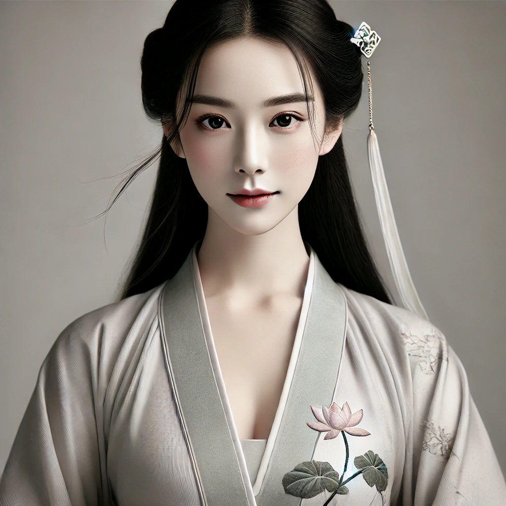 This image features a classic Chinese beauty with long flowing black hair, tied up with a jade hairpin. She is wearing a traditional silk dress adorned with delicate lotus embroidery, symbolizing purity and resilience. Her porcelain-like skin and serene expression reflect the elegance and wisdom typical of traditional Chinese culture. The minimalist background emphasizes her as the focal point, radiating both inner strength and cultural sophistication.